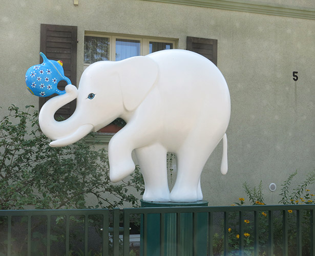 für ein Porzellan-Geschäft in Neubrandenburg (M-V) ein Ladenzeichen zu entwerfen. Bei der Abnahme des Gipsmodells fiel den Funktionären auf, dass auf der anderen Seite das Marktes ein Karl-Marx-Denkmal steht und die Bevölkerung scherzen könnte, der Elefant würde die Kanne nach Karl Marx werfen.